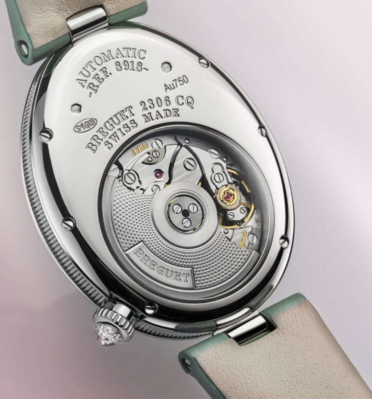 The ovoid-shaped case of the Reine de Naples 8918 measures 36.5 x 28.45mm (10.1 mm thick) and is crafted in 18k white gold. As is traditional for the vast majority of Reine de Naples watches, the bezel is set with diamonds. Look closer at the flange, and you’ll see a ring of diamonds there too. 117 brilliant-cut diamonds are spread across the bezel and flange; plus, the crown, which is positioned at 4 o’clock, is set with a briolette-cut diamond. Like all Breguet replica watches, the case sides are decorated with fine fluting. As expected, water resistance is not a priority here but if you’re curious, it is rated to 30 meters.