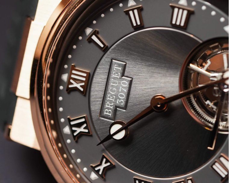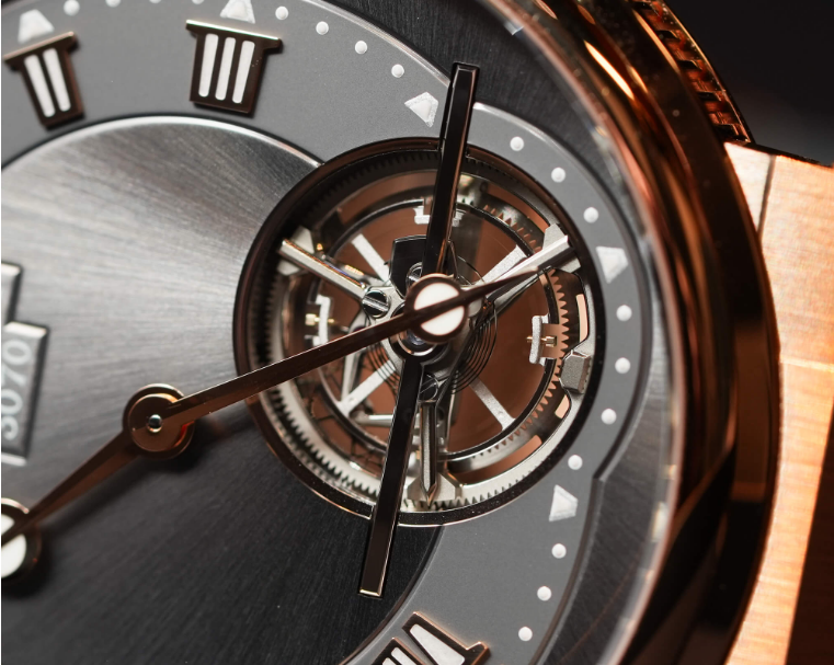 Despite being the main attraction, the dial is also where I think the watch falters. There is certainly a lot to like here. The slate grey dial features alternating finishes, with the hour and minute ring offering a matte contrast against the sunburst foundation. The beveled brand name and the sunburst pattern’s continuity through it are an excellent touch. The handset with its novel offset, bisected lume design was incredibly attractive in hand and on the wrist. The simple, tourbillon bridge telegraphed an understated sophistication; this isn’t some massive gold tourbillon cage with dramatic architecture.