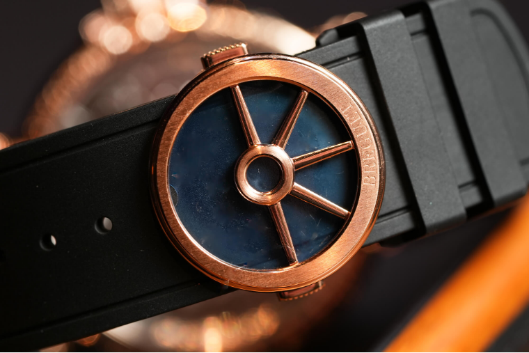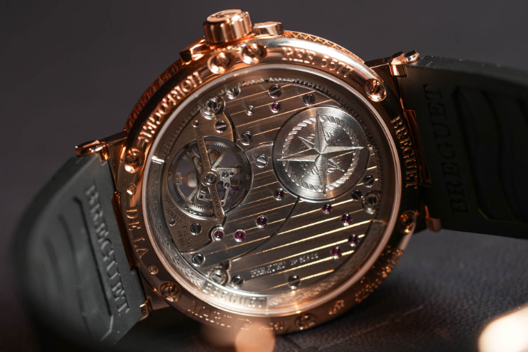 The case doesn’t mess around with the Marine collection’s design. The rose gold case is warm and welcoming, with a midcase with recessed grooving and the Marine collection’s signature crown and equally unique crown guards. Most of the case is polished, but the three-pronged lugs get a crisp brushed finishing. I’ve always enjoyed this case design, and in person it didn’t disappoint, wearing easily and feeling decidedly classy, especially for a six-figure watch with 100m water resistance. The rubber strap was comfortable, and I appreciated the nautical continuity with the ship’s wheel clasp. The overall effect of the Marine design is exactly what I imagine Breguet replica watch uk intended: a watch that brings a bit of sport to the heritage brand. At the same time, it is a sporty elegance rather than an elegant sportiness: the watch remains firmly situated on the formal side of things, and the tourbillon only reinforces that.