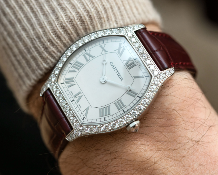 That said, the gem-set Cartier Tortue in platinum is an odd watch to wear. In its proportions, it lacks the eye-watering perfection of, say, a Lange 1, and its dial looks and feels as bland and basic as that of any Cartier fake watches offered at exactly a tenth of the price. On the other hand, its bling level is just enough to shred the concept of elegance into pieces and yet is not sufficient to offer the intimidating status many consciously or subconsciously seek when shelling out for a factory diamond-set, top-tier reference of a watch collection. Looking down at the Cartier Tortue on one’s wrist, it, therefore, is a mixed bag that can easily feel as though it fell right to the ground in between high-luxury elegance and taunting-daunting flash.